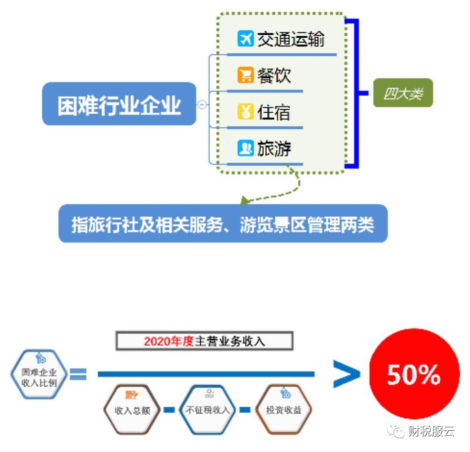 困难行业企业,包括交通运输、餐饮、住宿、旅游(指旅行社及相关服务、游览景区管理两类)四大类,具体判断标准按照现行《国民经济行业分类》执行。困难行业企业2020年度主营业务收入须占收入总额(剔除不征税收入和投资收益)的50%以上。