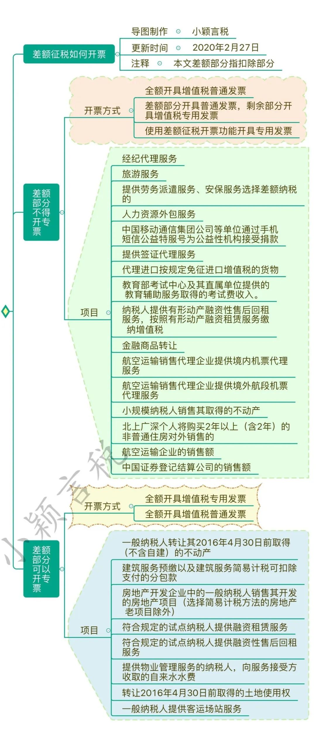 差额征税的开票方式除了文件明确规定差额部分(指扣除部分,下同)不得开具增值税专用发票以外,都可以全额开具,根据这个标准划分为两种类型,第一种是不得开具增值税专用发票,另一种是差额部分可以开具增值税专用发票。